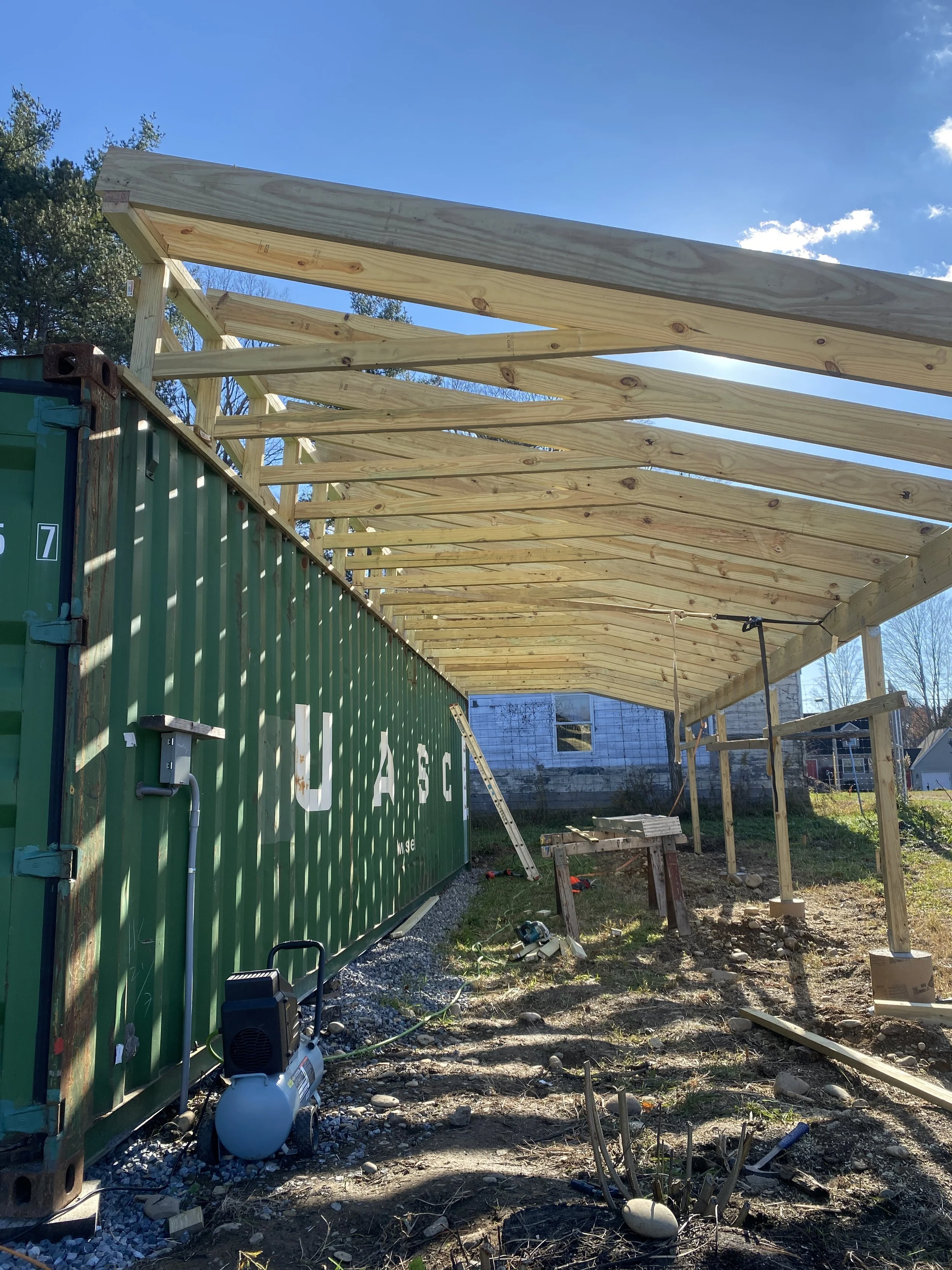 (Under Construction) - This roof will shelter a vegetable wash and pack station on an organic farm in upstate New York. Utilizing the container as our main wall, the roof will allow shelter from the elements and expand the usable space of the container area.